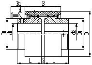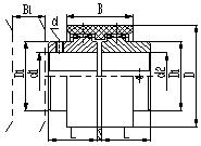 型號 | 公稱扭矩 Tn /N·m | 允許轉速[n] /r·min-1 | 軸孔直徑 d1、d2 | 軸孔長度 L J1 | D | D1 | B | B1 | S | d | 品質m/kg | 動彈慣量I /kg·m2 | |||||
